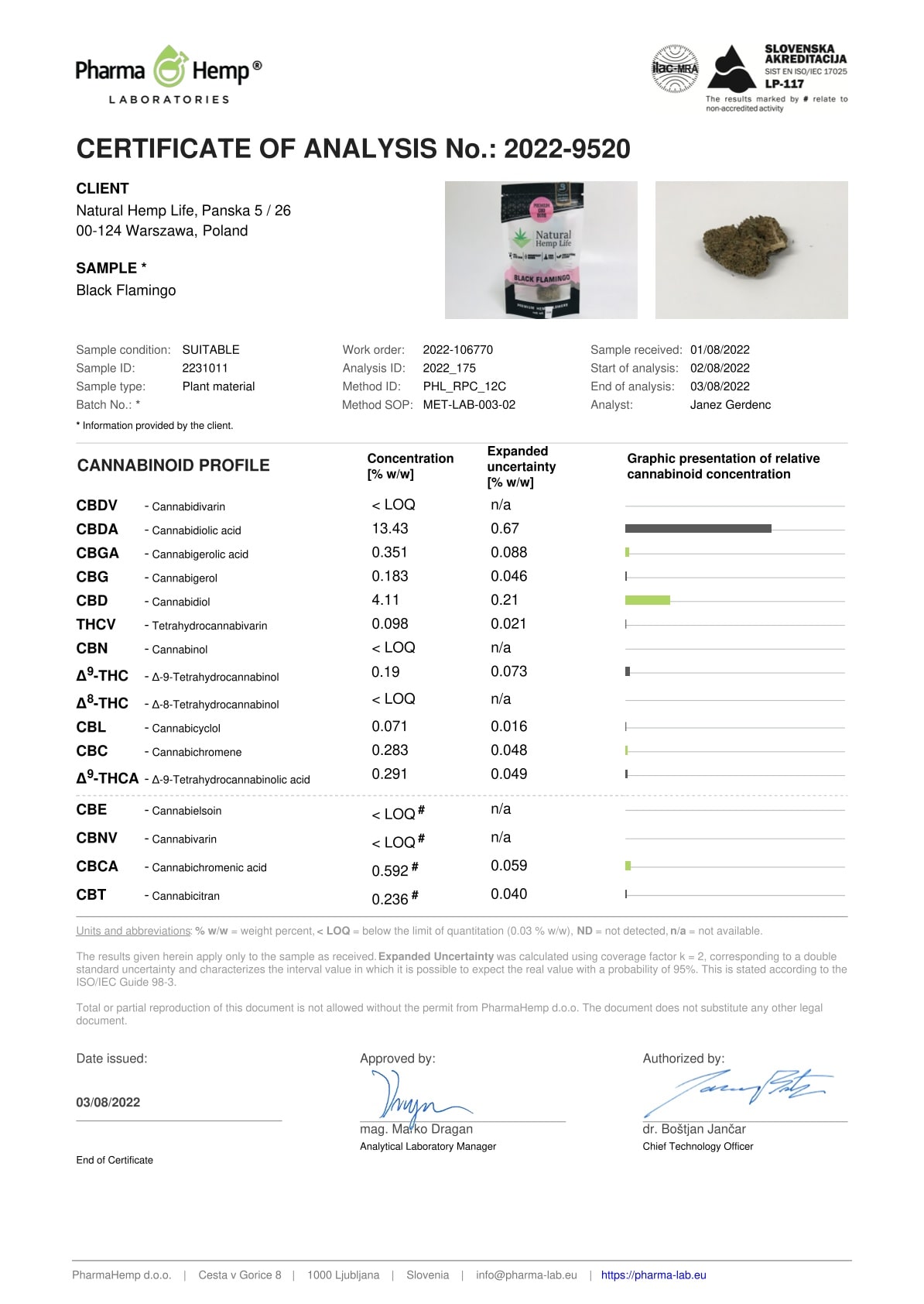 Black Flamingo kombinerer det bedste fra to verdener – høj CBD koncentration med store og kompakte buds. Flamingo er dominerende i terpenerne pinene og limonen, hvilket giver blomsterne en meget potent aroma af jord og citrus. Inkluderet i hver pose er en fugtregulator, som sikrer, at budsene holder en stabil fugtighed på 62%.